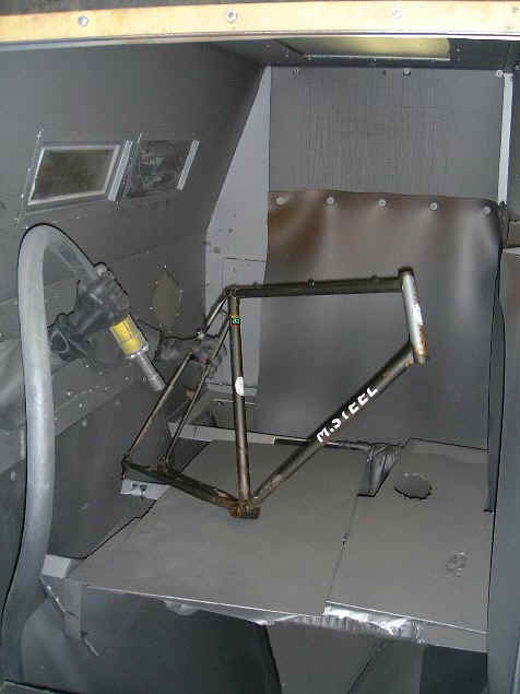 The old paint and corrosion is stripped off in the shot blaster.