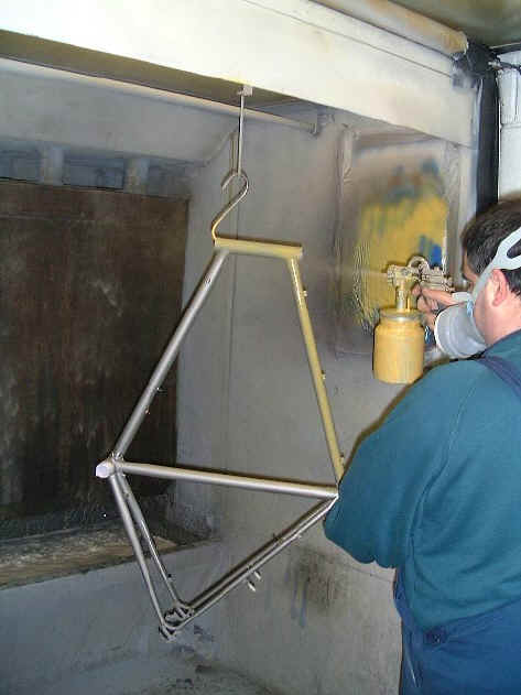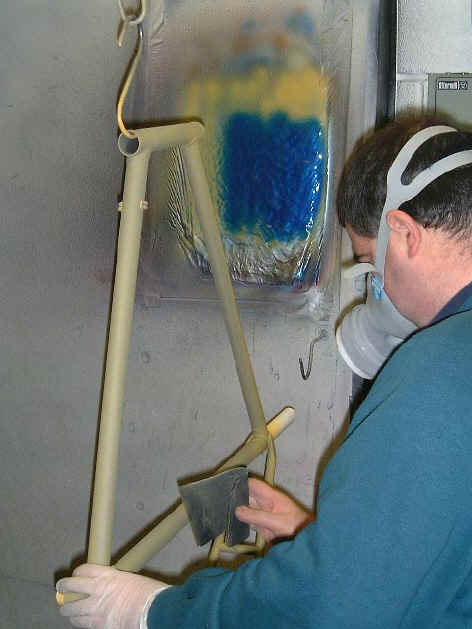The frame is lightly rubbed down before painting (left) and then dusted with the blow gun (right).