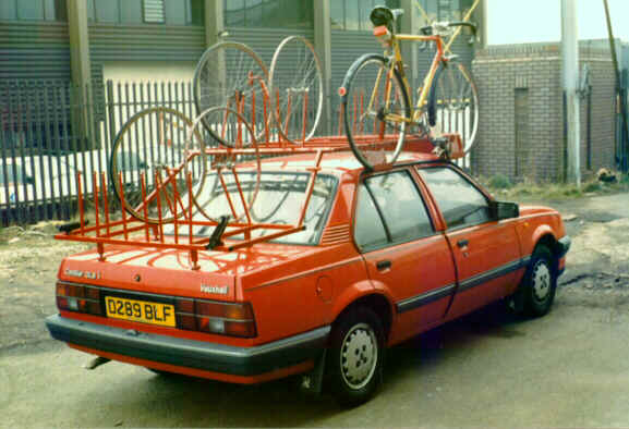 A custom roof rack made by Dave Yates for the Percy Bilton pro team. Ideal if you too want to carry 6 bikes and 14 wheels !!