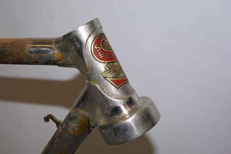 A rather rusted M G Selbach frame, as received above. The customer asked if we could save the head badge.